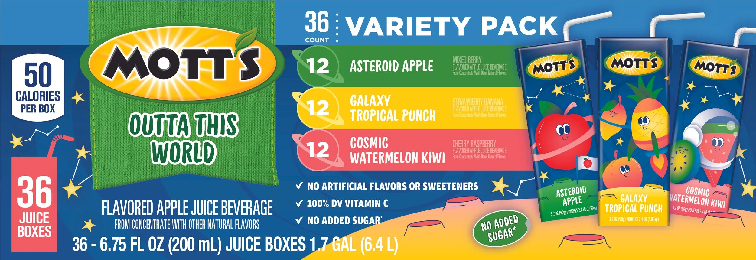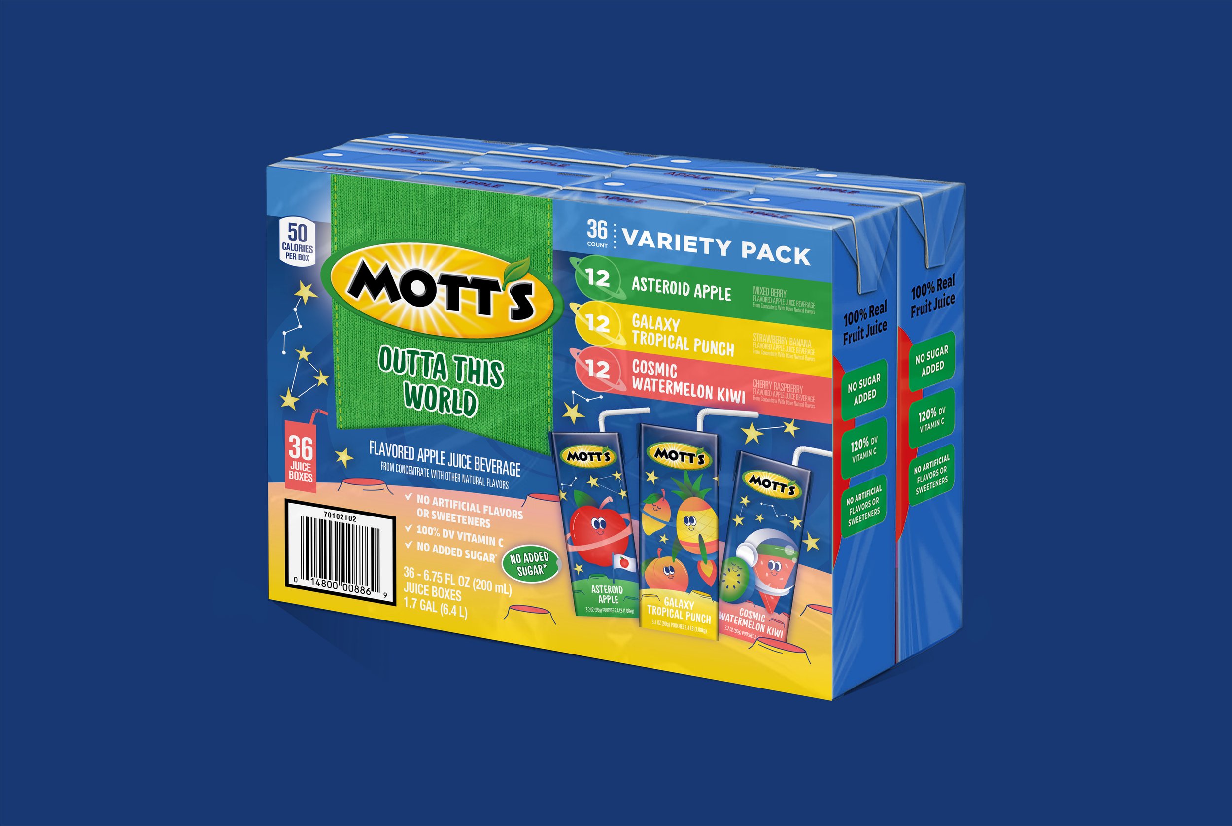 For this project, I designed the packaging for a Mott’s juice box variety pack centered around an outer space theme to spark a sense of discovery and excitement for kids. I created a bold, imaginative visual system featuring playful space-inspired illustrations—planets, rockets, and character-driven elements—paired with vibrant, fruit-forward graphics to differentiate each flavor. Applied across the tetra pack juice boxes and the outer carton, the design delivers a cohesive and engaging shelf presence that feels fun, dynamic, and distinctly Mott’s while capturing the curiosity of younger consumers.