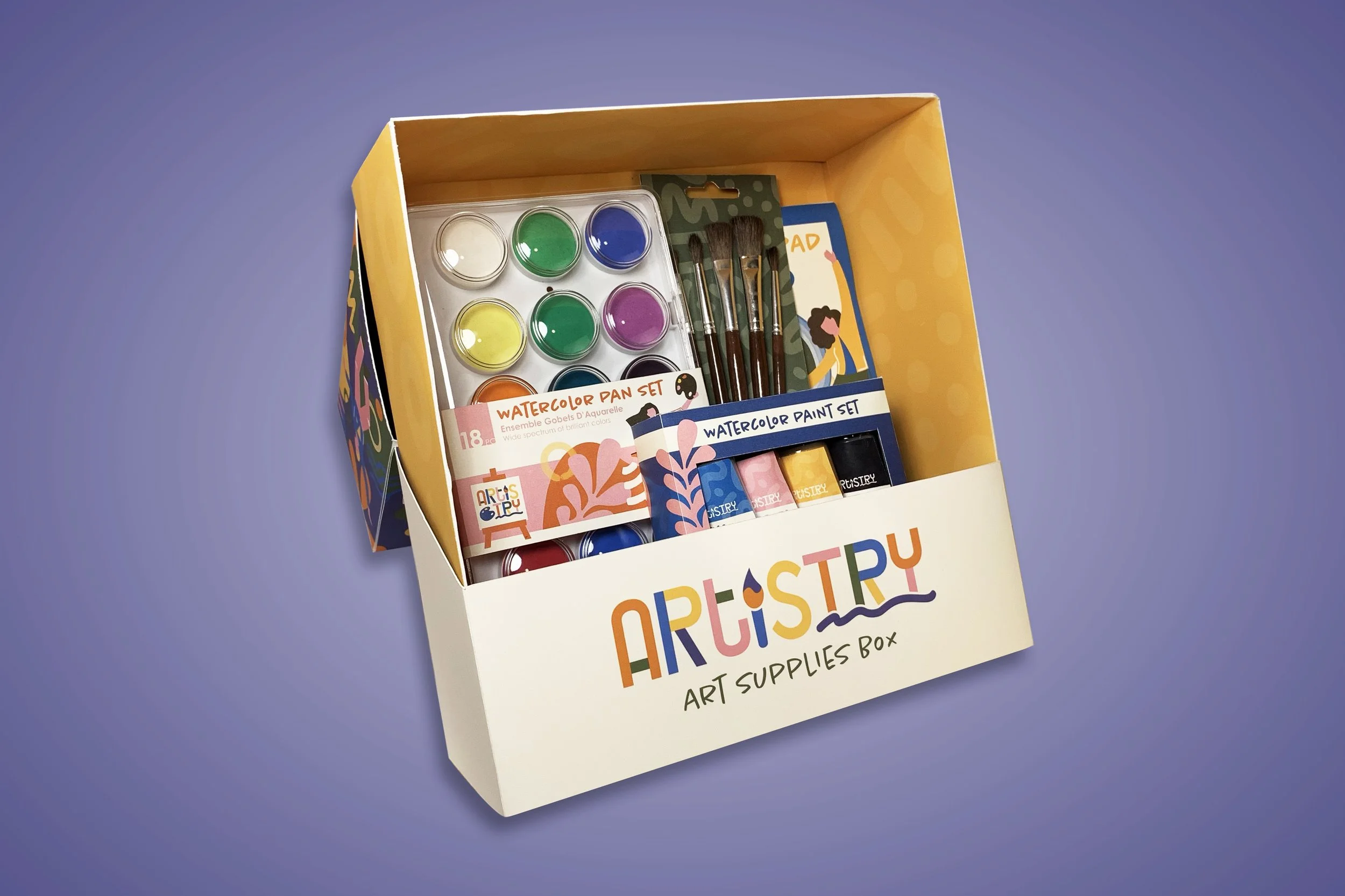 Most art subscription boxes on the market today are pricey and do not allow creators to sample products before purchasing them. As a result, I wanted to focus on creating a cohesive art subscription box series that offers art supply samples at an affordable cost. My solution was Artistry, an affordable art subscription box that sends monthly art supplies straight to your door.